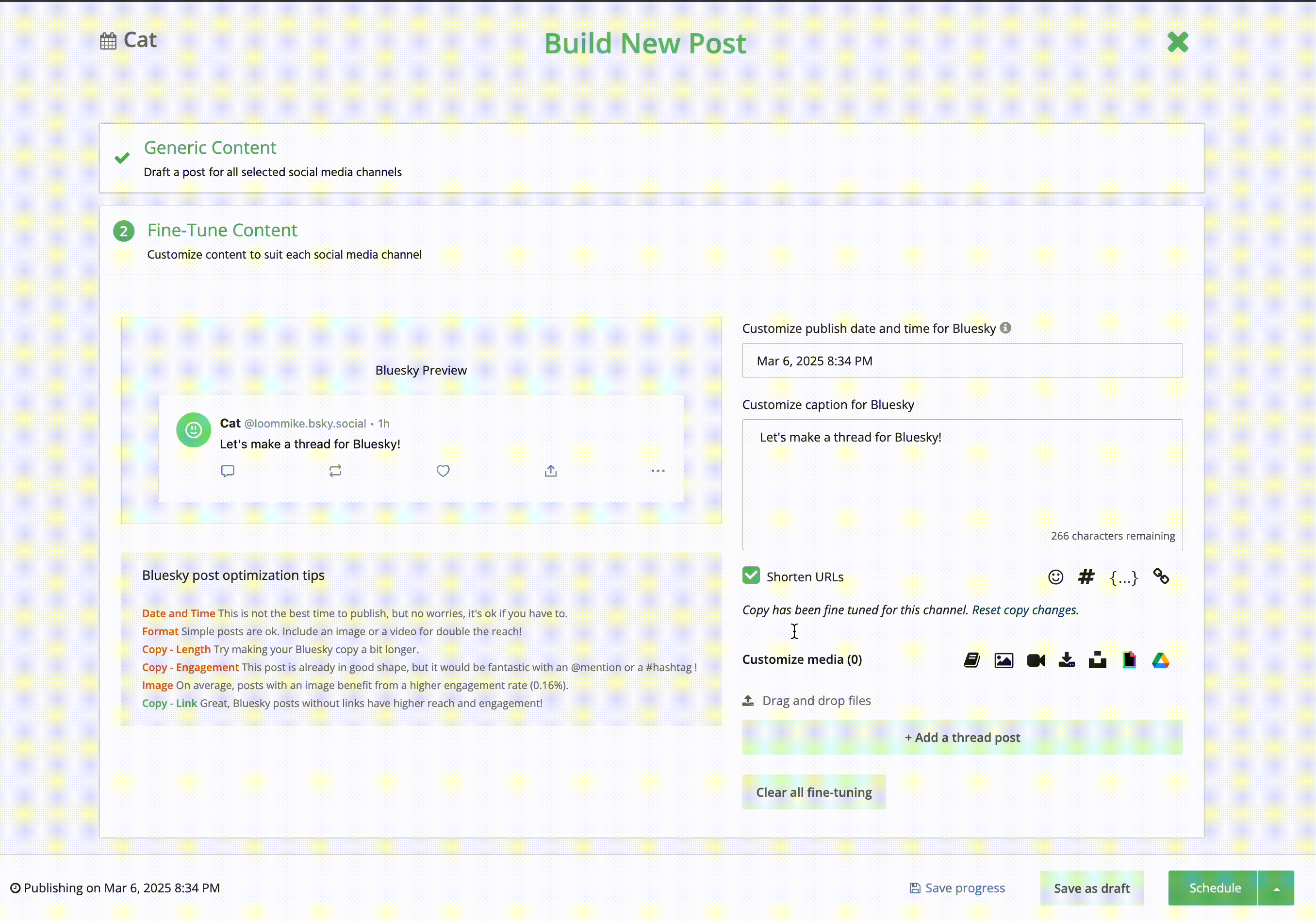 - In the Fine-Tune Content step for Bluesky, click Add a thread post below the caption field